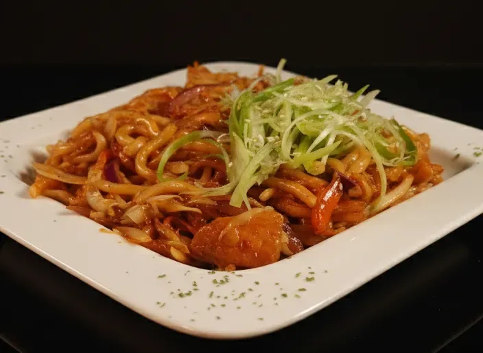 Fideos tipo Udon (gorditos) salteados con condimentos estilo coreano, zanahoria, cebolla y tu elección de pollo (239), res (266) o camarones (279).