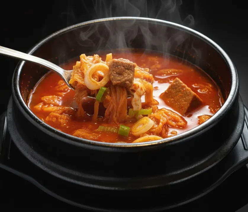 Guiso de Kimchi con Tofu, cebollina y huevo.