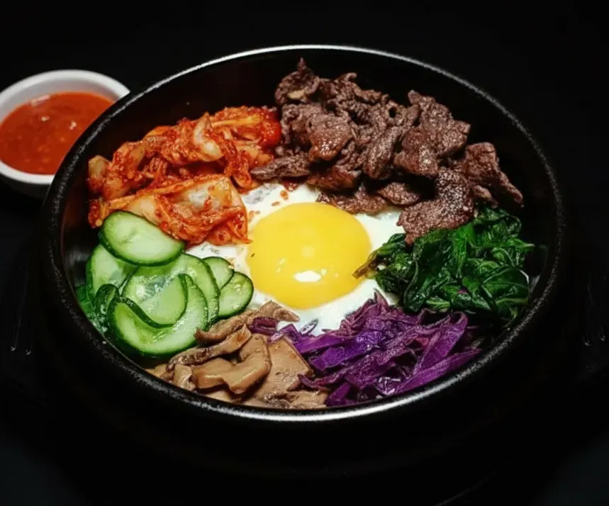 Consta de arroz coreano tostado en su base con aceite de ajonjolí y servido con huevo, kimchi, pepinillo, y vegetales salteados (295)